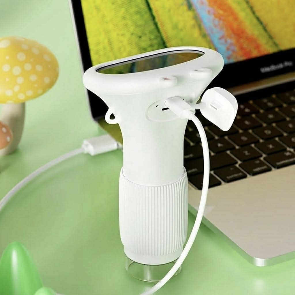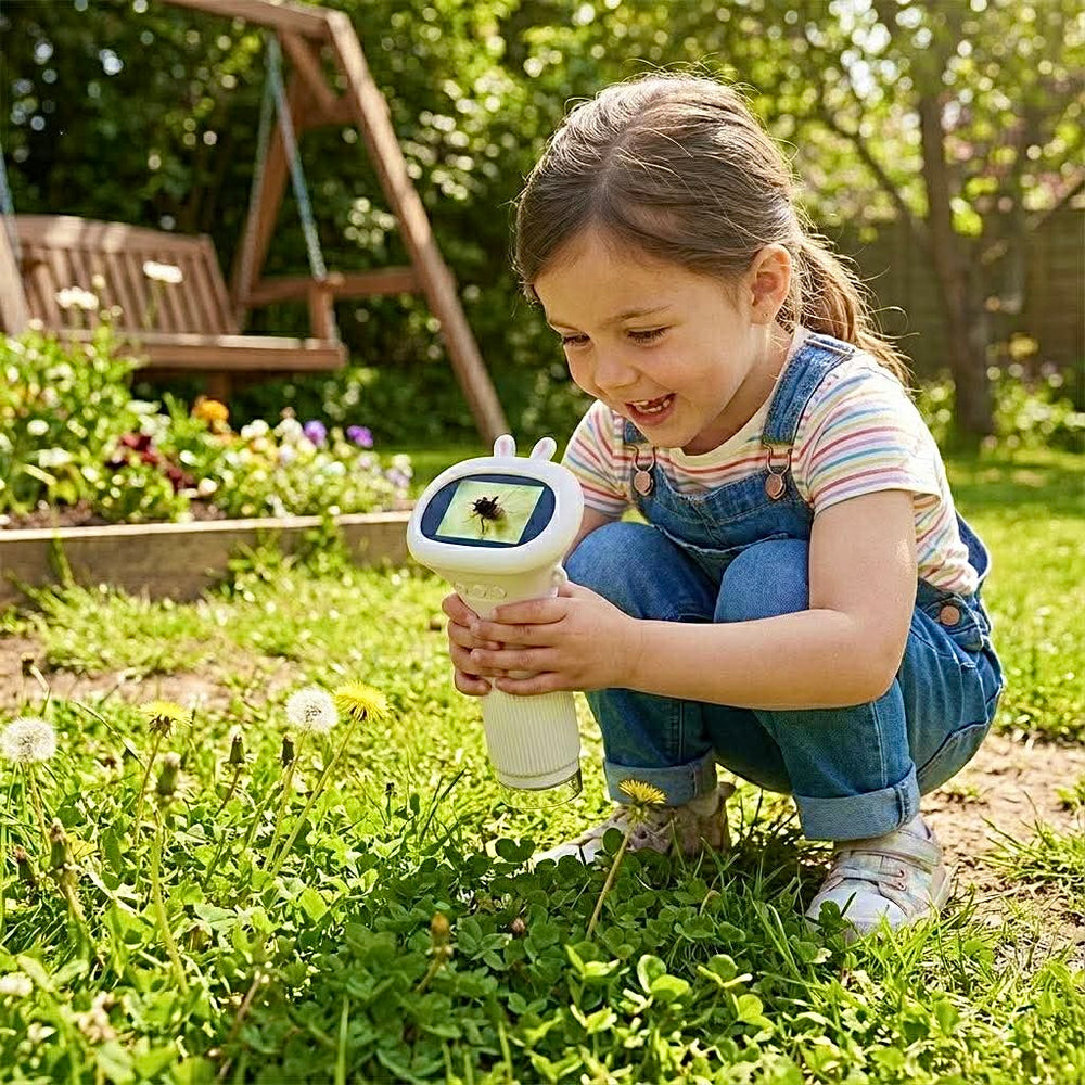Posiada duże, czytelne przyciski i ergonomiczny kształt pasujący do małych rączek. Wystarczy włączyć urządzenie i przyłożyć je do obiektu — obraz pojawia się na ekranie automatycznie.